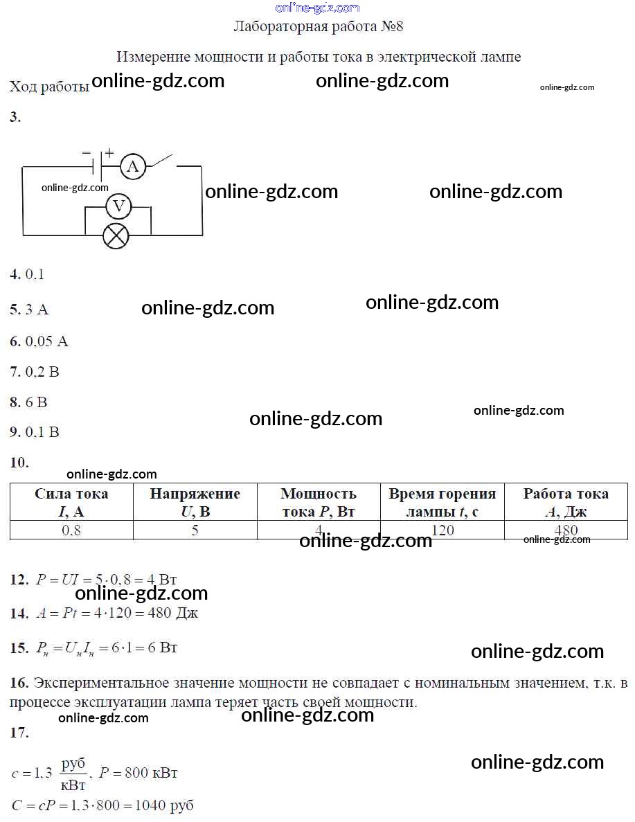 Готовые домашние задания по Физике за 8 класс Тетрадь для лабораторных работ Минькова, Иванова УМК 2014 - Лабораторные работы ЛР №8. Измерение мощности и работы тока в электрической лампе