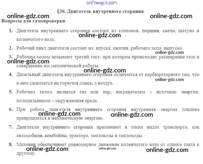 Готовые домашние задания по Физике за 8 класс Учебник Пурышева, Важеевская Вертикаль 2017 - Вопросы к параграфам § 36. Двигатель внутреннего сгорания
