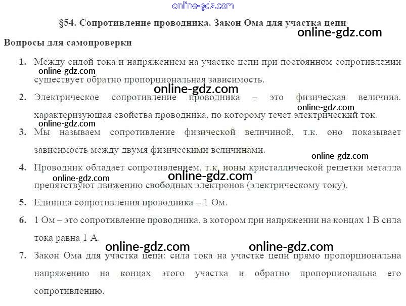 Готовые домашние задания по Физике за 8 класс Учебник Пурышева, Важеевская Вертикаль 2017 - Вопросы к параграфам § 54. Сопротивление проводника. Закон Ома для участка цепи