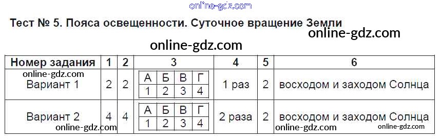 Готовые домашние задания по Географии за 5 класс Тесты Пятунин, Пятунина УМК 2017 - Земля как планета солнечной системы Тест 5