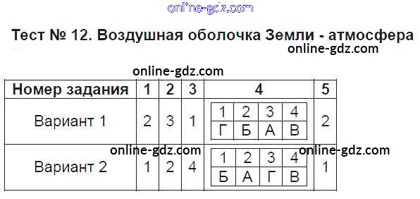 Готовые домашние задания по Географии за 5 класс Тесты Пятунин, Пятунина УМК 2017 - Атмосфера Тест 12