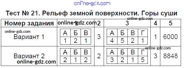 Готовые домашние задания по Географии за 6 класс Тесты Пятунина, Пятунин УМК 2017 - Тесты Тест-21. Рельеф земной поверхности. Горы суши