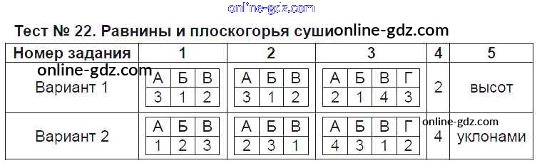 Готовые домашние задания по Географии за 6 класс Тесты Пятунина, Пятунин УМК 2017 - Тесты Тест-22. Равнины и плоскогорья суши
