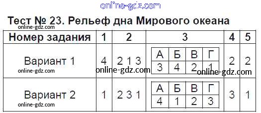 Готовые домашние задания по Географии за 6 класс Тесты Пятунина, Пятунин УМК 2017 - Тесты Тест-23. Рельеф дна Мирового океана
