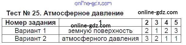 Готовые домашние задания по Географии за 6 класс Тесты Пятунина, Пятунин УМК 2017 - Тесты Тест-25. Атмосферное давление