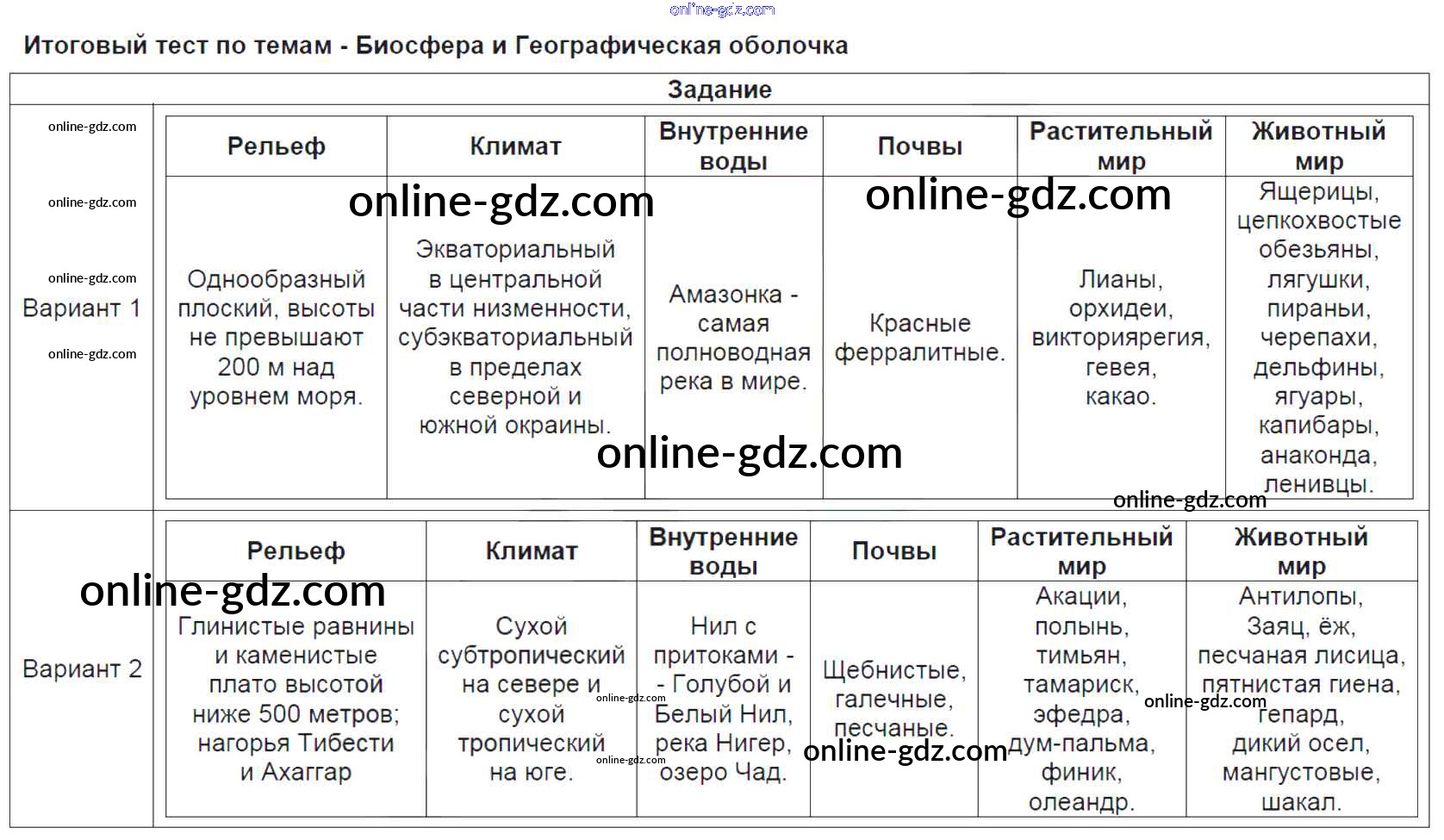 Готовые домашние задания по Географии за 6 класс Тесты Пятунина, Пятунин УМК 2017 - Итоговые тесты Тесты Итоговый тест по темам - Биосфера и Географическая оболочка