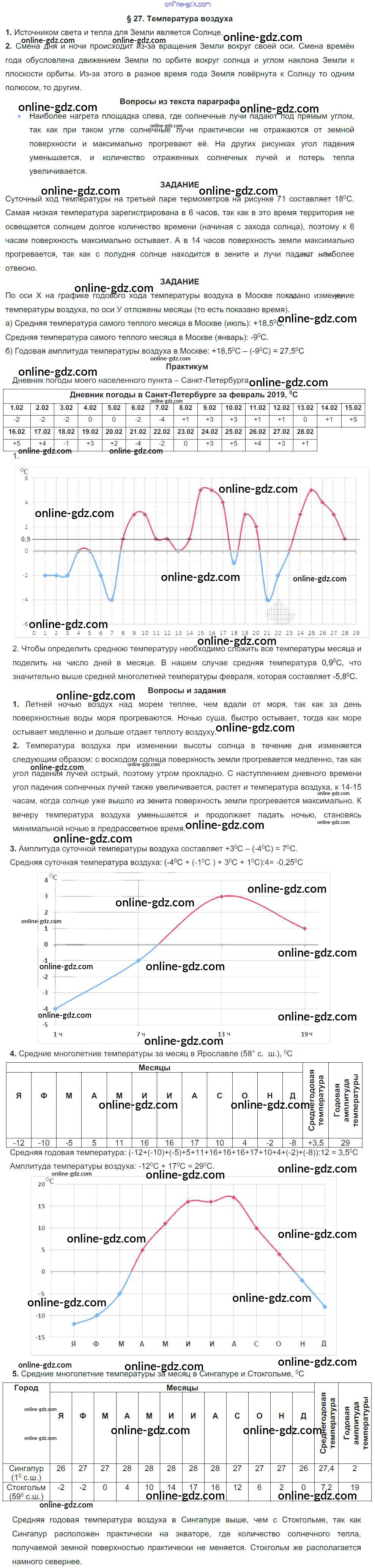 Готовые домашние задания по Географии за 6 класс Учебник Герасимова, Неклюкова Вертикаль 2019 - Параграфы §27. Температура воздуха