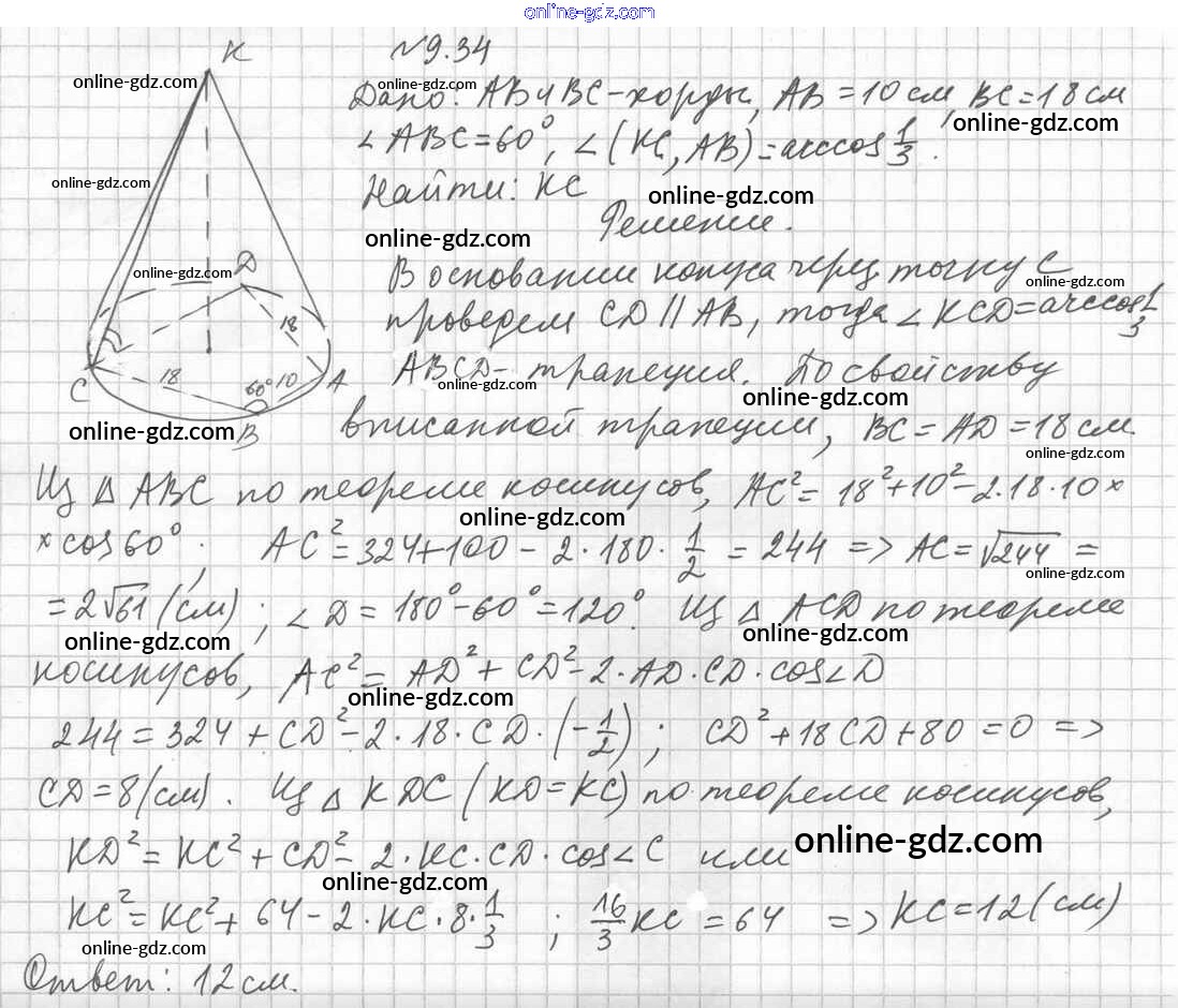 Готовые домашние задания по Геометрии за 11 класс Учебник Мерзляк, Номировский Алгоритм успеха Углубленный уровень 2019 - §9. Конус 9.34