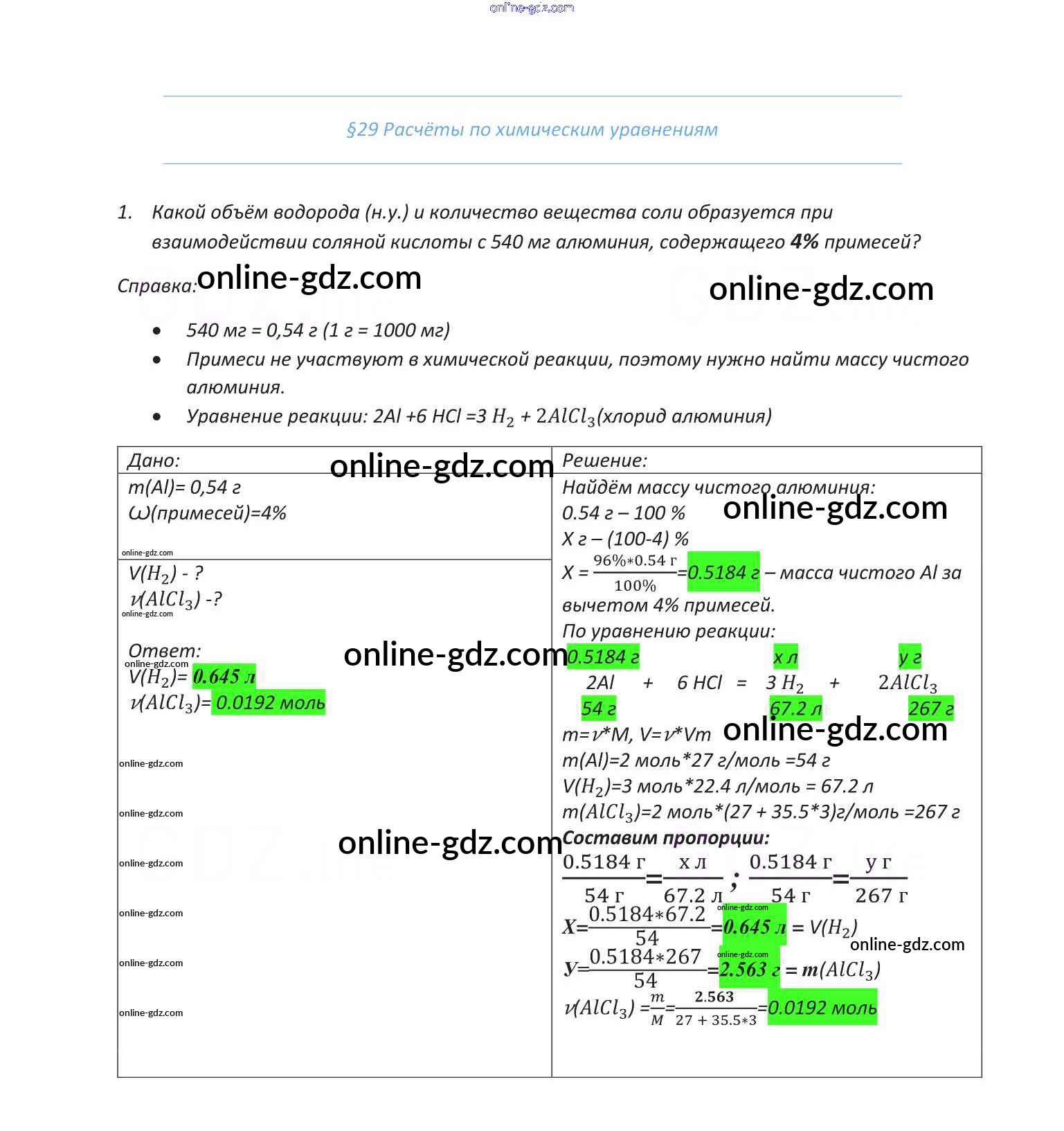 Готовые домашние задания по Химии за 8 класс Учебник Габриелян Вертикаль 2019 - §29. Расчёты по химическим уравнениям 1