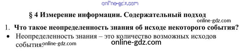 Готовые домашние задания по Информатике за 10 класс Учебник Семакин, Хеннер Базовый уровень 2017 - §4. Измерение информации. Содержательный подход 1