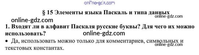 Готовые домашние задания по Информатике за 10 класс Учебник Семакин, Хеннер Базовый уровень 2017 - §15. Элементы языка Паскаль и типы данных 1