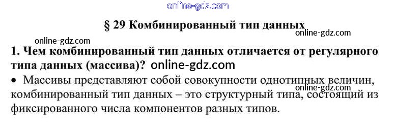 Готовые домашние задания по Информатике за 10 класс Учебник Семакин, Хеннер Базовый уровень 2017 - §29. Комбинированный тип данных 1