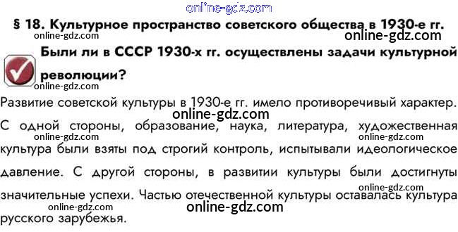 Готовые домашние задания по Истории за 10 класс Учебник Горинов, Данилов 2016 - Вопрос в начале параграфа §18. Культурное пространство советского общества в 1930-е гг. 1
