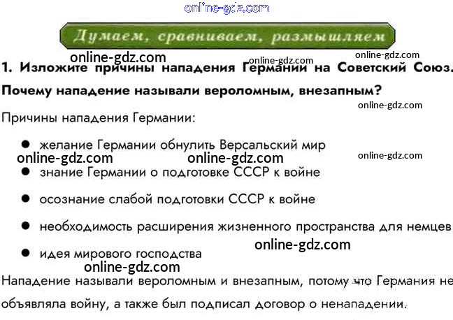 Готовые домашние задания по Истории за 10 класс Учебник Горинов, Данилов 2016 - Думаем, сравниваем, размышляем §21. Начало Великой Отечественной войны. Первый период войны (22 июня 1941 — ноябрь 1942 г.) 1