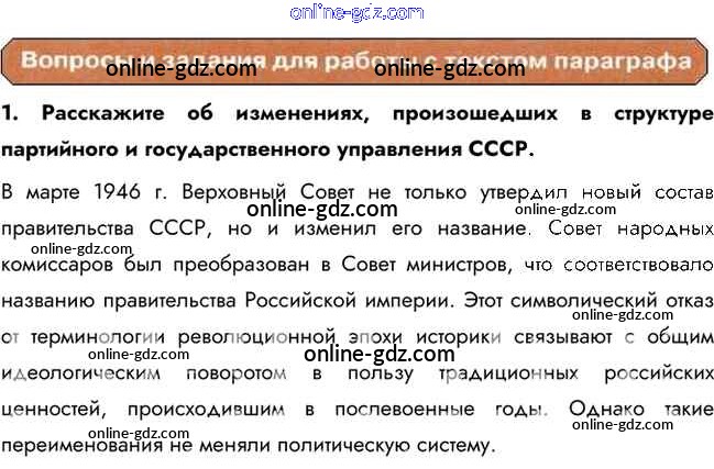Готовые домашние задания по Истории за 10 класс Учебник Горинов, Данилов 2016 - Вопросы и задания для работы с текстом параграфа §28. Изменения в политической системе в послевоенные годы 1