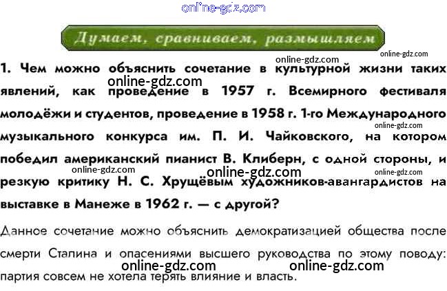 Готовые домашние задания по Истории за 10 класс Учебник Горинов, Данилов 2016 - Думаем, сравниваем, размышляем §33. Культурное пространство и повседневная жизнь в середине 1950-х — середине 1960-х гг. 1