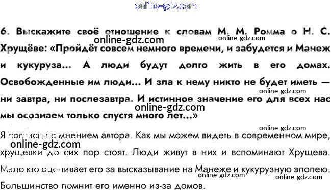 Готовые домашние задания по Истории за 10 класс Учебник Горинов, Данилов 2016 - Думаем, сравниваем, размышляем §33. Культурное пространство и повседневная жизнь в середине 1950-х — середине 1960-х гг. 6