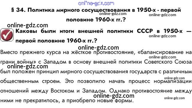 Готовые домашние задания по Истории за 10 класс Учебник Горинов, Данилов 2016 - Вопрос в начале параграфа §34. Политика мирного сосуществования в 1950-х — первой половине 1960-х гг. 1