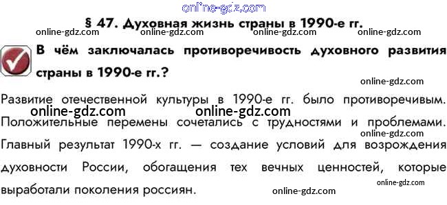 Готовые домашние задания по Истории за 10 класс Учебник Горинов, Данилов 2016 - Вопрос в начале параграфа §47. Духовная жизнь страны в 1990-е гг. 1