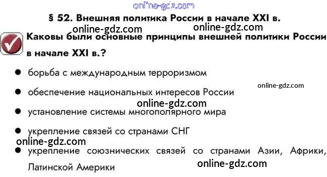 Готовые домашние задания по Истории за 10 класс Учебник Горинов, Данилов 2016 - Вопрос в начале параграфа §52. Внешняя политика России в начале XXI в. 1