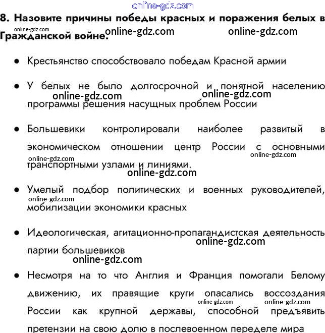 Готовые домашние задания по Истории за 11 класс Учебник Загладин, Петров Инновационная школа Базовый уровень 2014 - Вопросы и задания §13. Гражданская война и интервенция 8