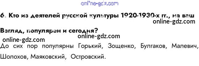 Готовые домашние задания по Истории за 11 класс Учебник Загладин, Петров Инновационная школа Базовый уровень 2014 - Вопросы и задания §19. Культура и искусство СССР в межвоенные годы 6