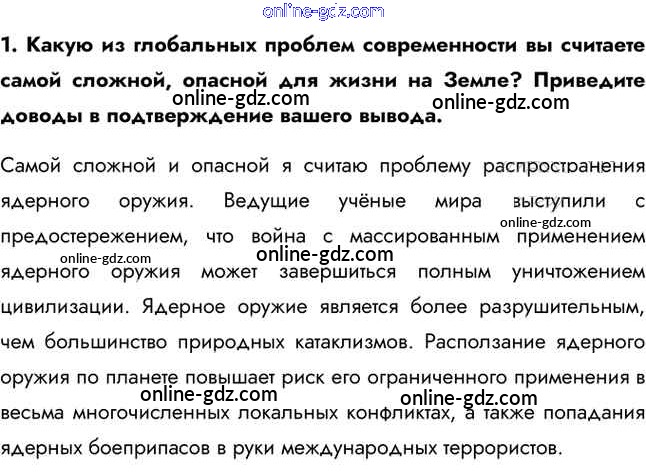 Готовые домашние задания по Истории за 11 класс Учебник Загладин, Петров Инновационная школа Базовый уровень 2014 - Вопросы и задания §61. Глобальные угрозы человечеству и поиски путей их преодоления 1