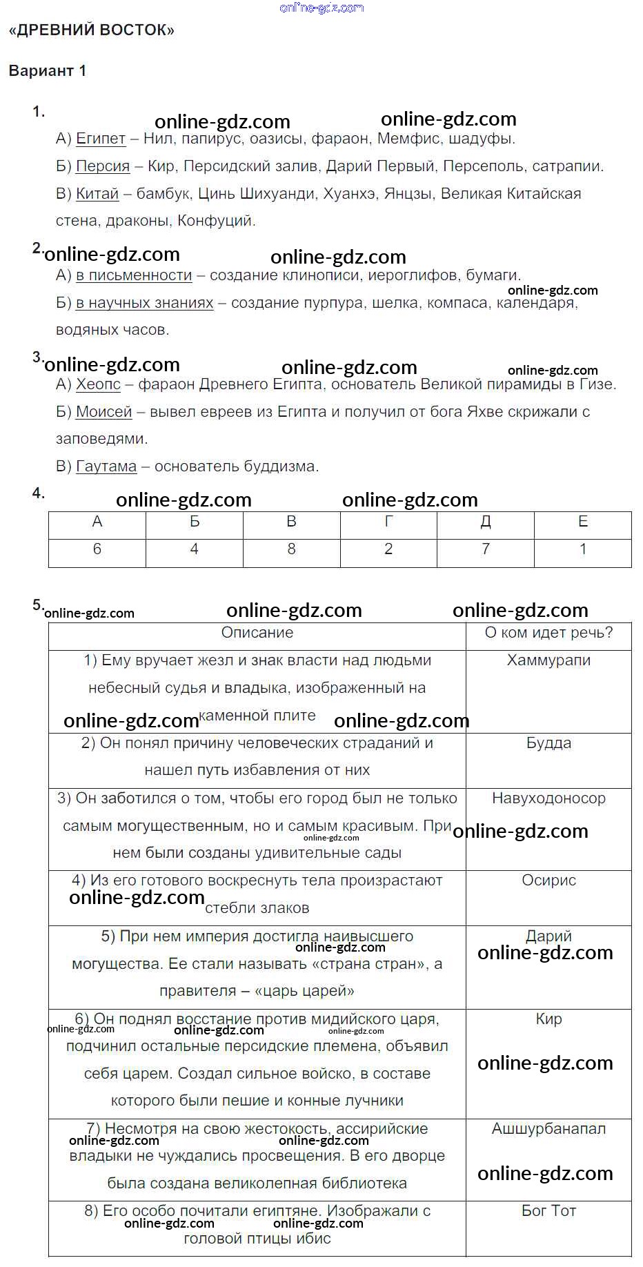 Готовые домашние задания по Истории за 5 класс Тематический контроль Саплина 2016 - КР-2. Древний Восток Контрольные работы вариант №1
