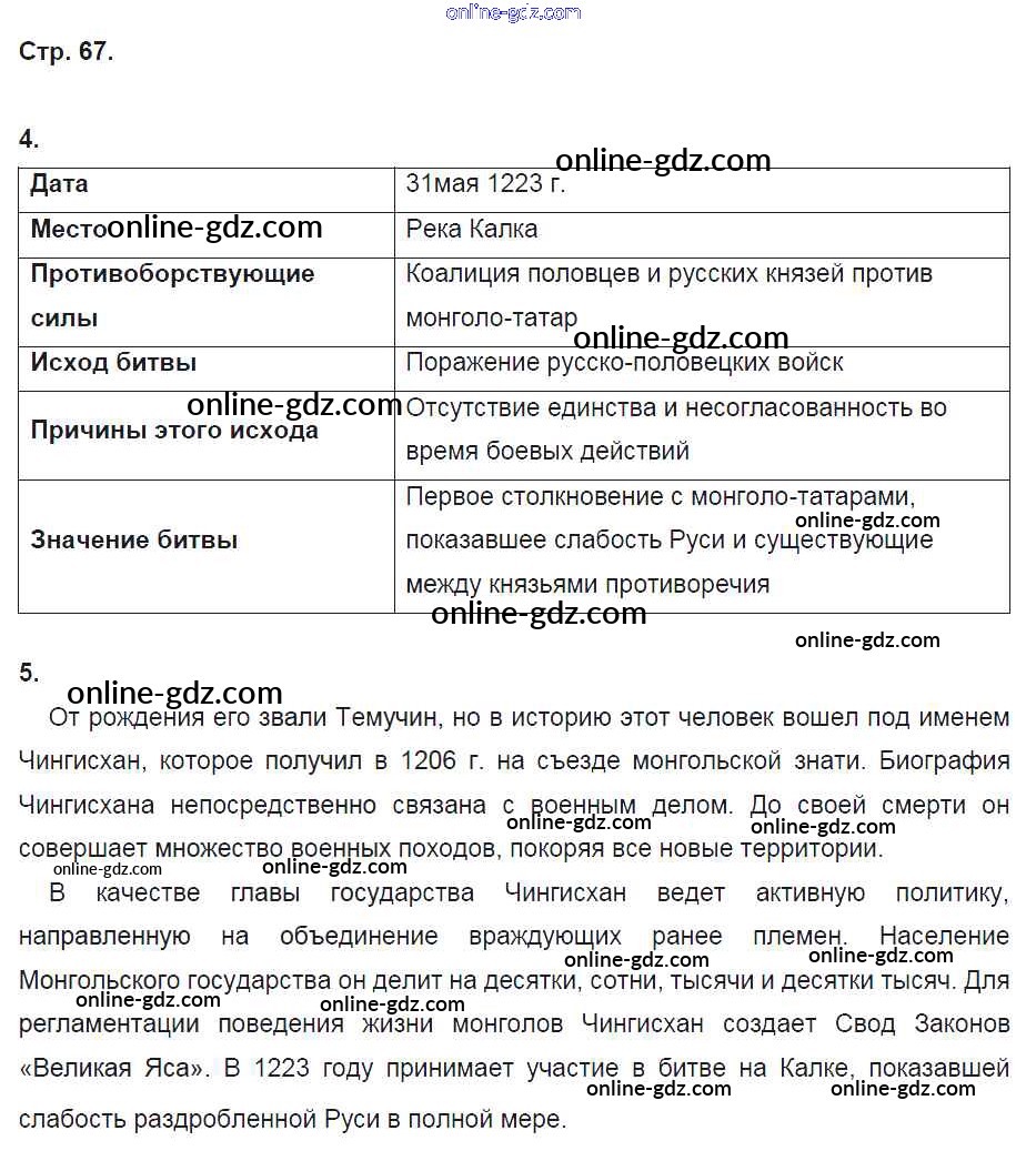 Готовые домашние задания по Истории за 6 класс Рабочая тетрадь Артасов, Данилов 2016 - §15. Монгольская Империя и изменение политической карты мира стр. 67