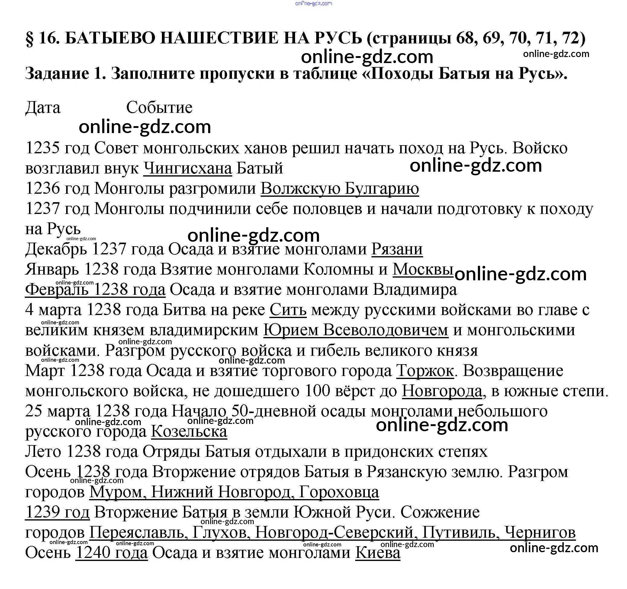 Готовые домашние задания по Истории за 6 класс Рабочая тетрадь Артасов, Данилов 2016 - §16. Батыево нашествие на Русь стр. 68