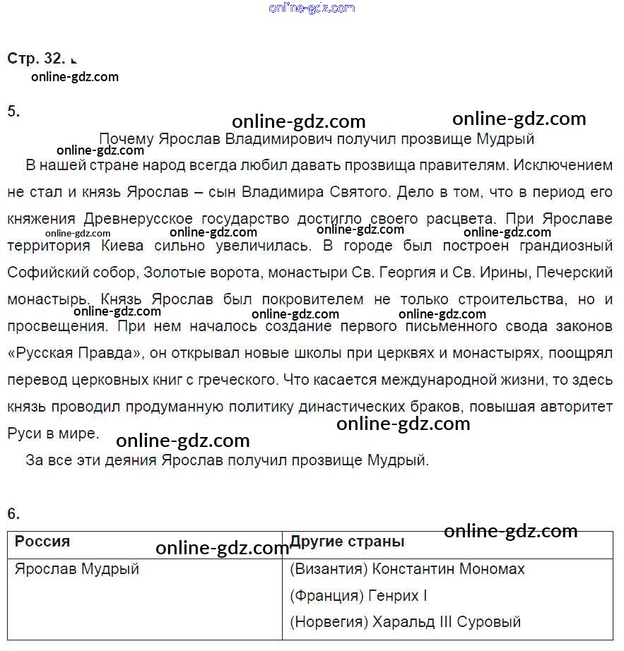 Готовые домашние задания по Истории за 6 класс Рабочая тетрадь Артасов, Данилов 2016 - §7. Русское государство при Ярославе Мудром стр. 32