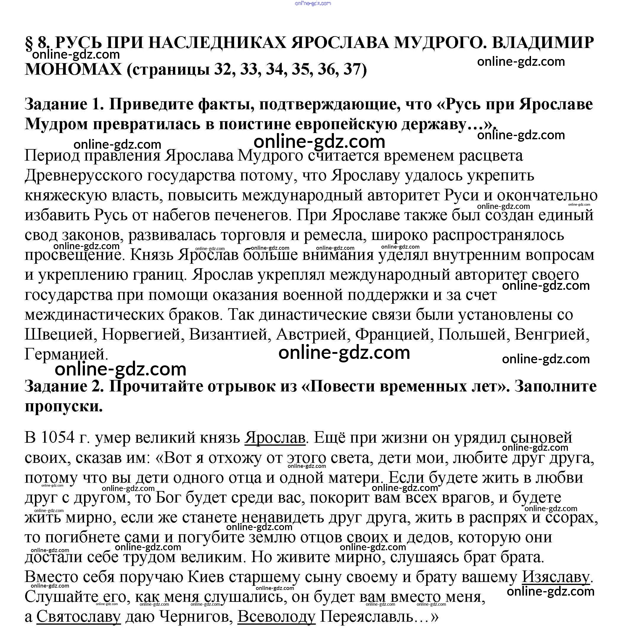 Готовые домашние задания по Истории за 6 класс Рабочая тетрадь Артасов, Данилов 2016 - §8. Русь при наследниках Ярослава Мудрого. Владимир Мономах стр. 32