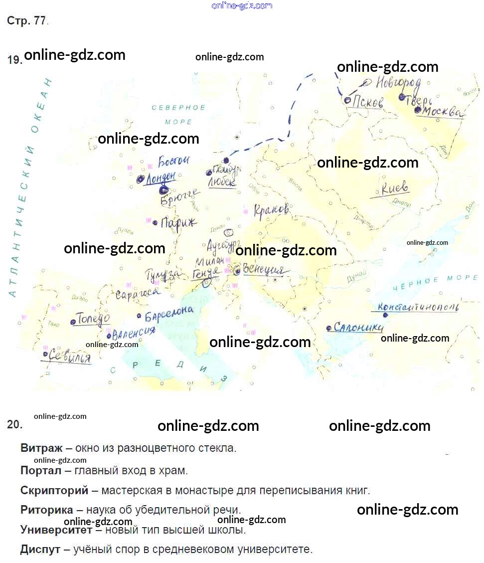 Готовые домашние задания по Истории за 6 класс Рабочая тетрадь Петрова Инновационная школа 2017 - Глава 7. Лики средневекового города стр. 77