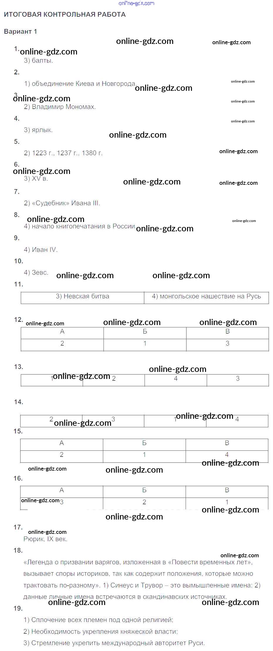 Готовые домашние задания по Истории за 6 класс Тематический контроль Артасов, Гаврилина 2015 - Итоговая контрольная работа Вариант-1
