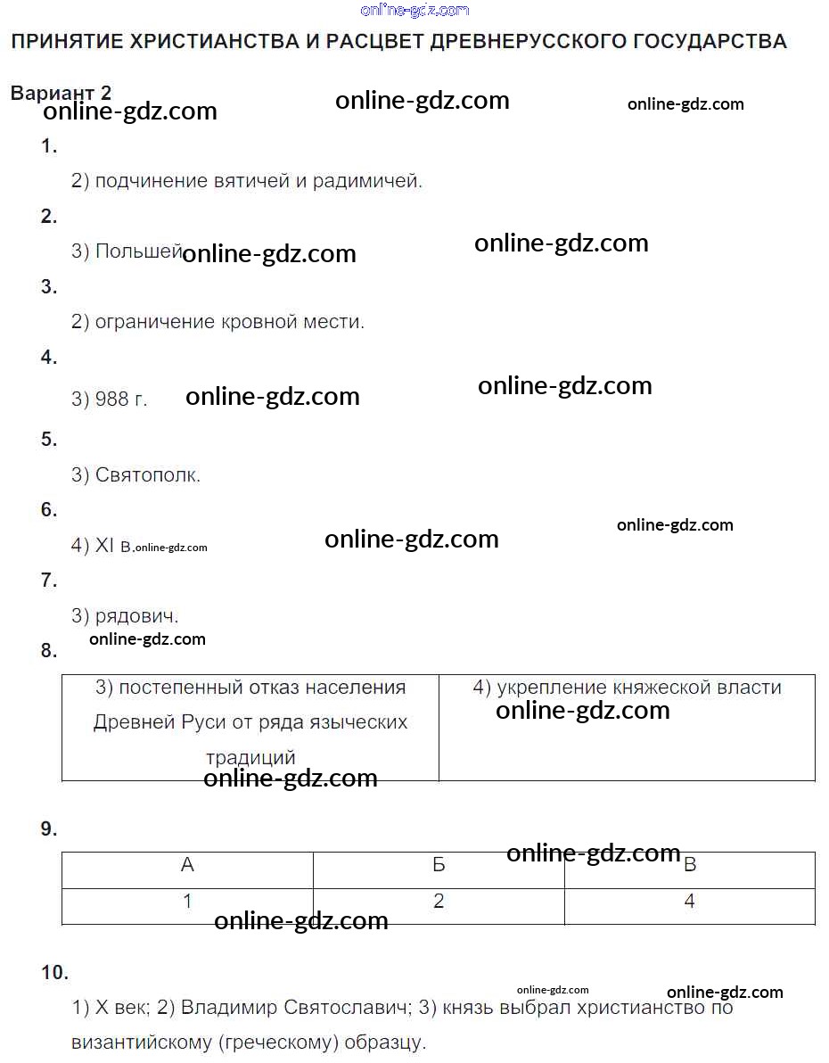 Готовые домашние задания по Истории за 6 класс Тематический контроль Артасов, Гаврилина 2015 - СР-№2. Принятие христианства и расцвет Древнерусского государства Русь Древняя Вариант-2