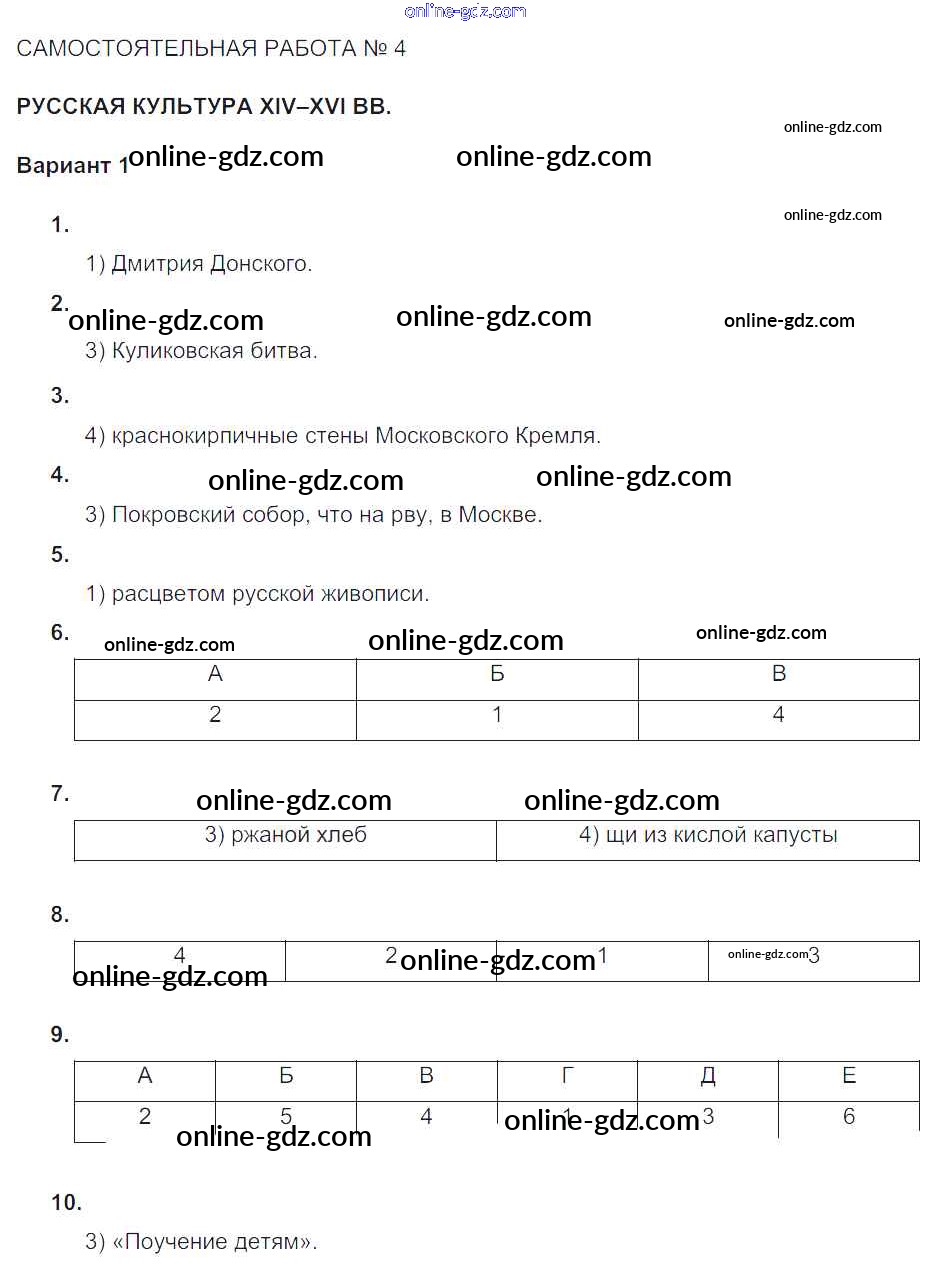 Готовые домашние задания по Истории за 6 класс Тематический контроль Артасов, Гаврилина 2015 - СР-№4. Русская культура в XIV-XVI вв. Русь Московская Вариант-1