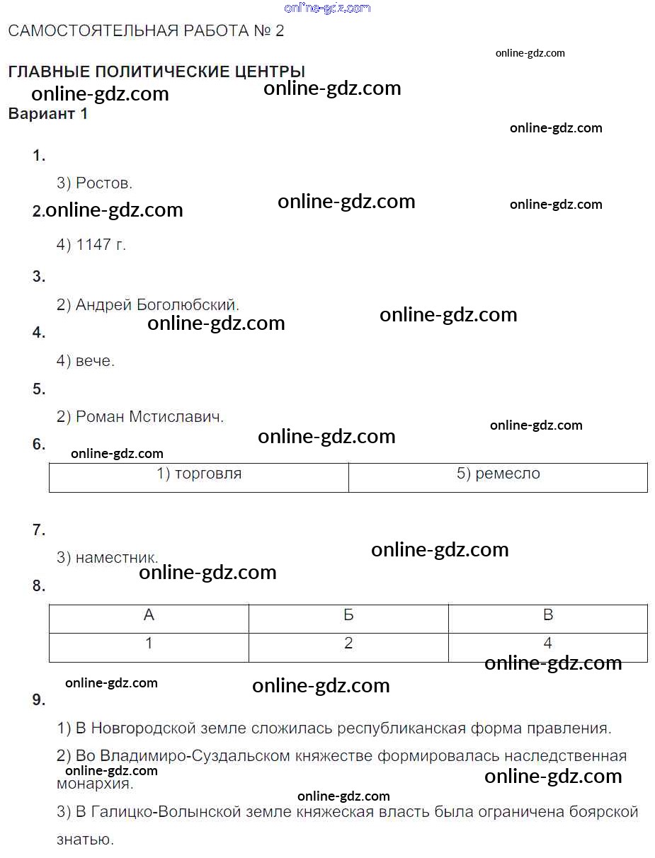 Готовые домашние задания по Истории за 6 класс Тематический контроль Артасов, Гаврилина 2015 - СР-№2. Главные политические центры Формирование самостоятельных государственных образований на Руси Вариант-1
