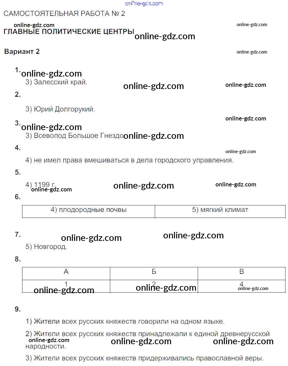Готовые домашние задания по Истории за 6 класс Тематический контроль Артасов, Гаврилина 2015 - СР-№2. Главные политические центры Формирование самостоятельных государственных образований на Руси Вариант-2
