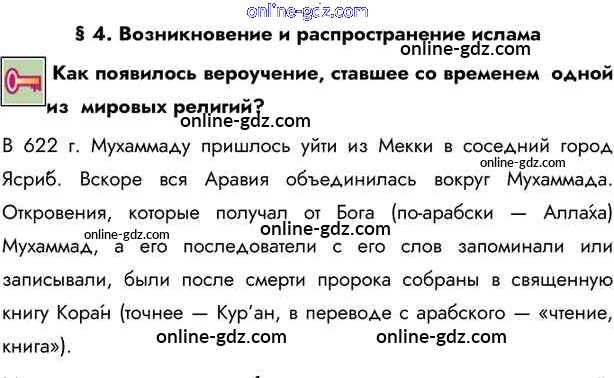 Готовые домашние задания по Истории за 6 класс Учебник Бойцов, Шукуров Инновационная школа 2019 - Ключевые вопросы §4. Возникновение и распространение ислама 1