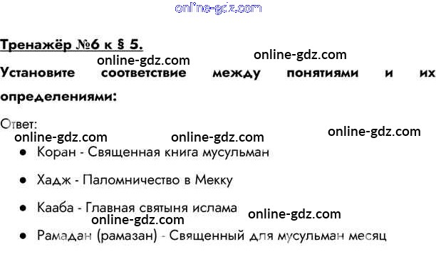 Готовые домашние задания по Истории за 6 класс Учебник Бойцов, Шукуров Инновационная школа 2019 - Тренажёр §5. Мир ислама 6