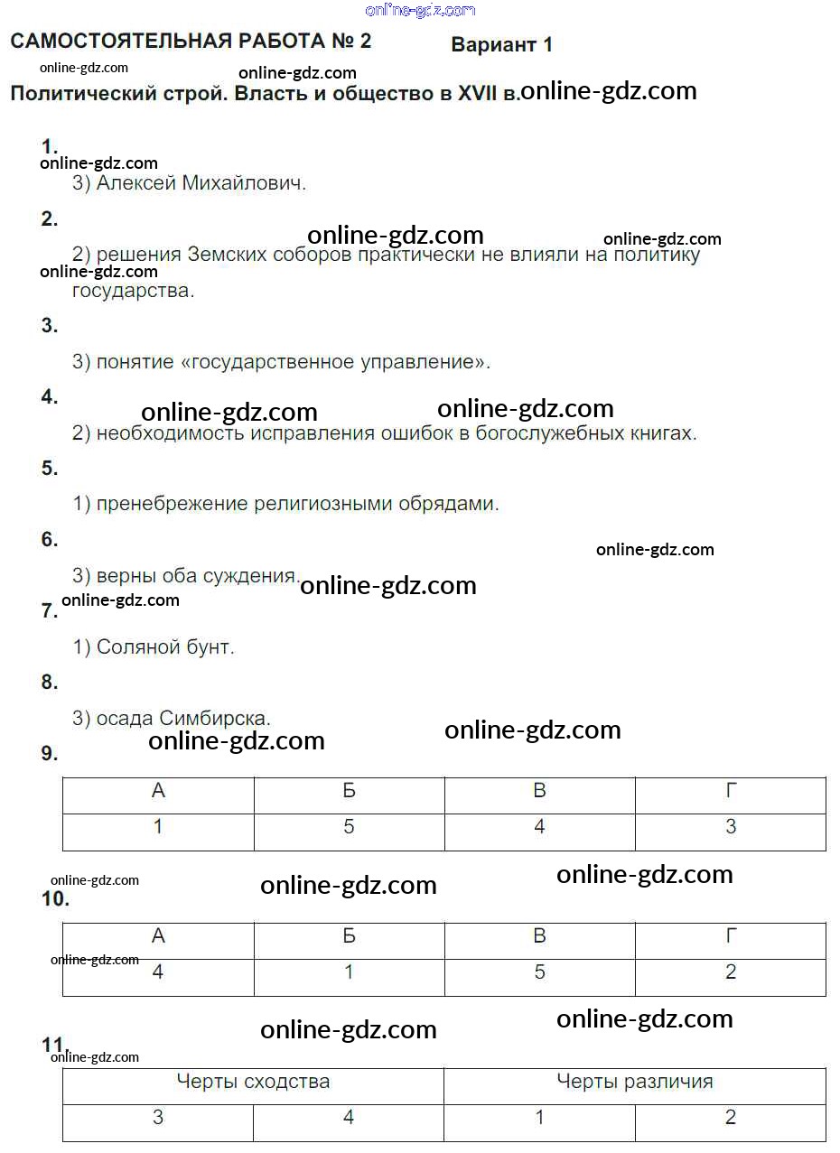 Готовые домашние задания по Истории за 7 класс Рабочая тетрадь Акиньшина, Артасов 2013 - СР-2. Политический строй. Власть и общество в XVII веке Россия в XVII веке Вариант 1