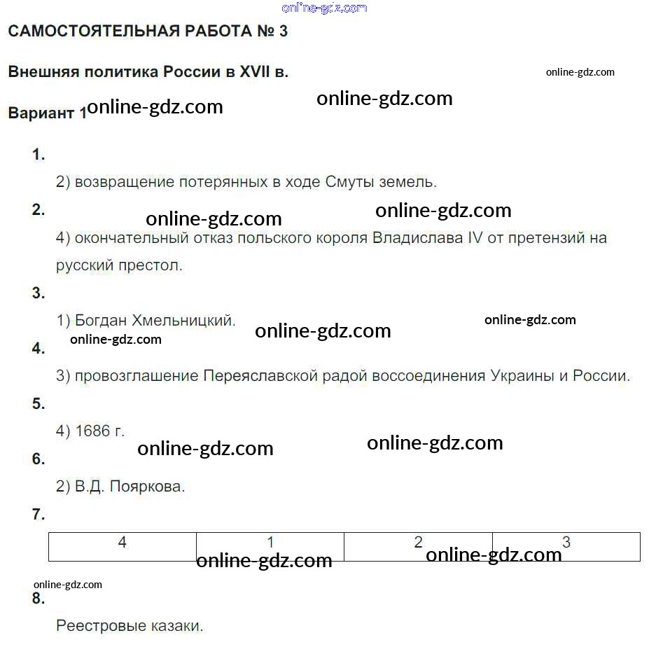 Готовые домашние задания по Истории за 7 класс Рабочая тетрадь Акиньшина, Артасов 2013 - СР-3. Внешняя политика России в XVII веке Россия в XVII веке Вариант 1