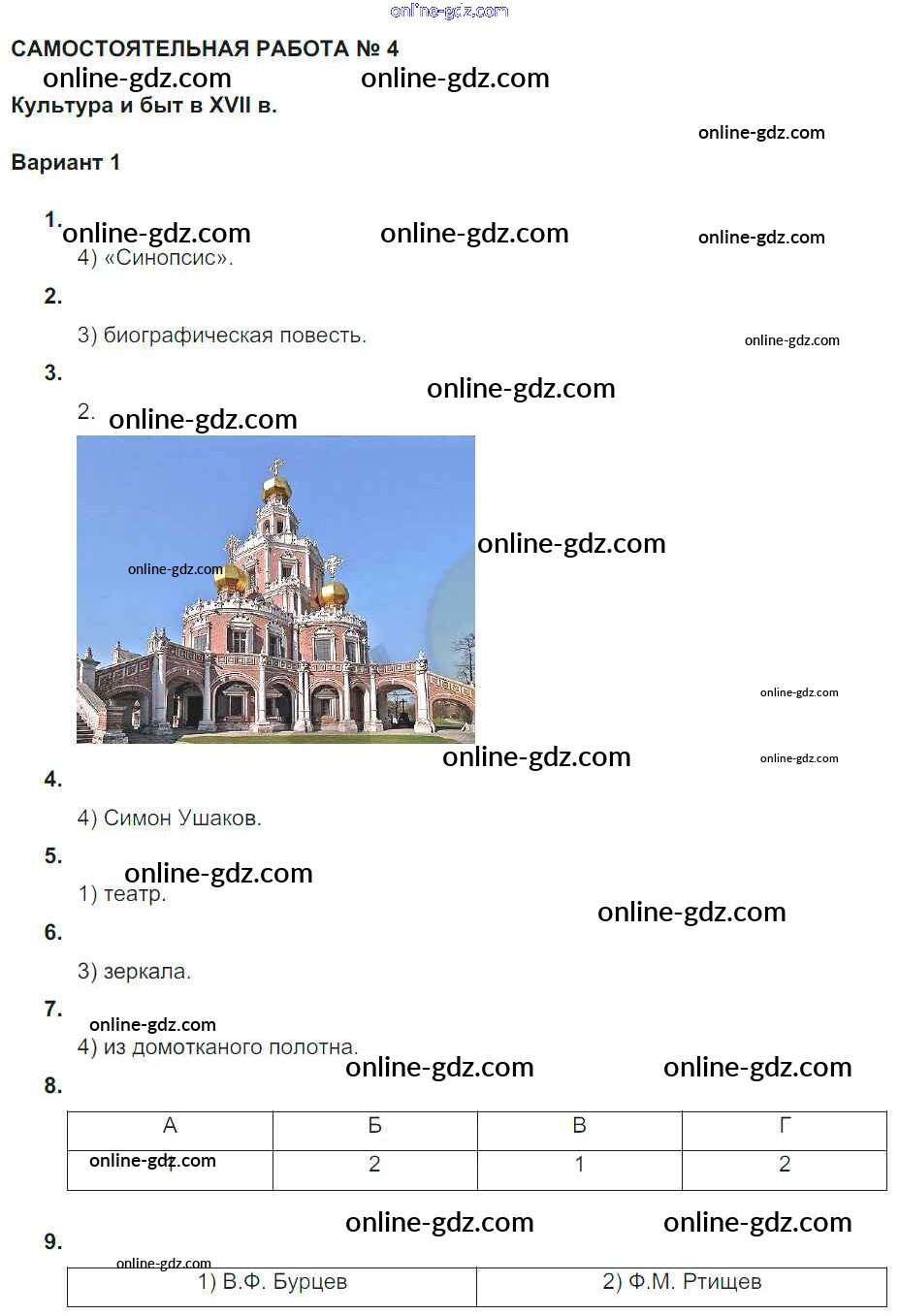 Готовые домашние задания по Истории за 7 класс Рабочая тетрадь Акиньшина, Артасов 2013 - СР-4. Культура и быт в XVII веке Россия в XVII веке Вариант 1