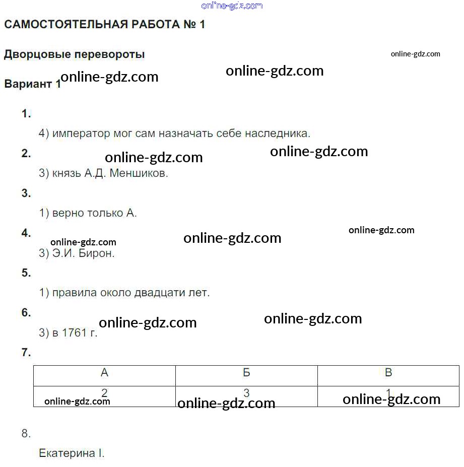 Готовые домашние задания по Истории за 7 класс Рабочая тетрадь Акиньшина, Артасов 2013 - СР-1. Дворцовые перевороты Российская империя в 1725-1762 гг Вариант 1