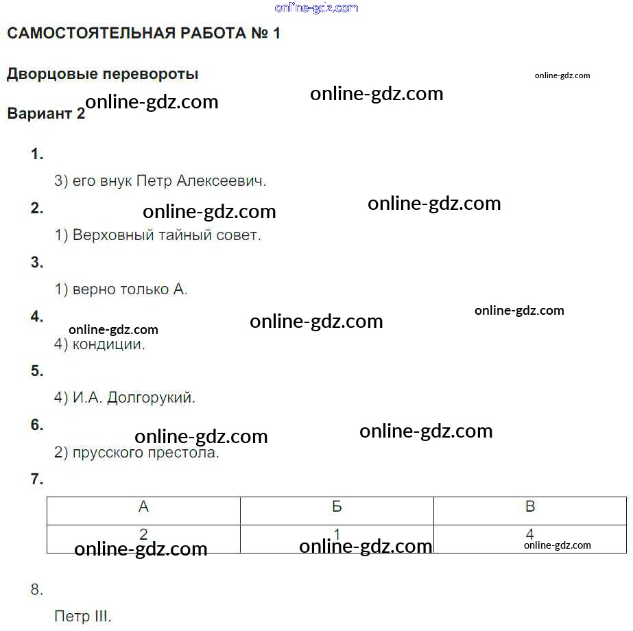 Готовые домашние задания по Истории за 7 класс Рабочая тетрадь Акиньшина, Артасов 2013 - СР-1. Дворцовые перевороты Российская империя в 1725-1762 гг Вариант 2