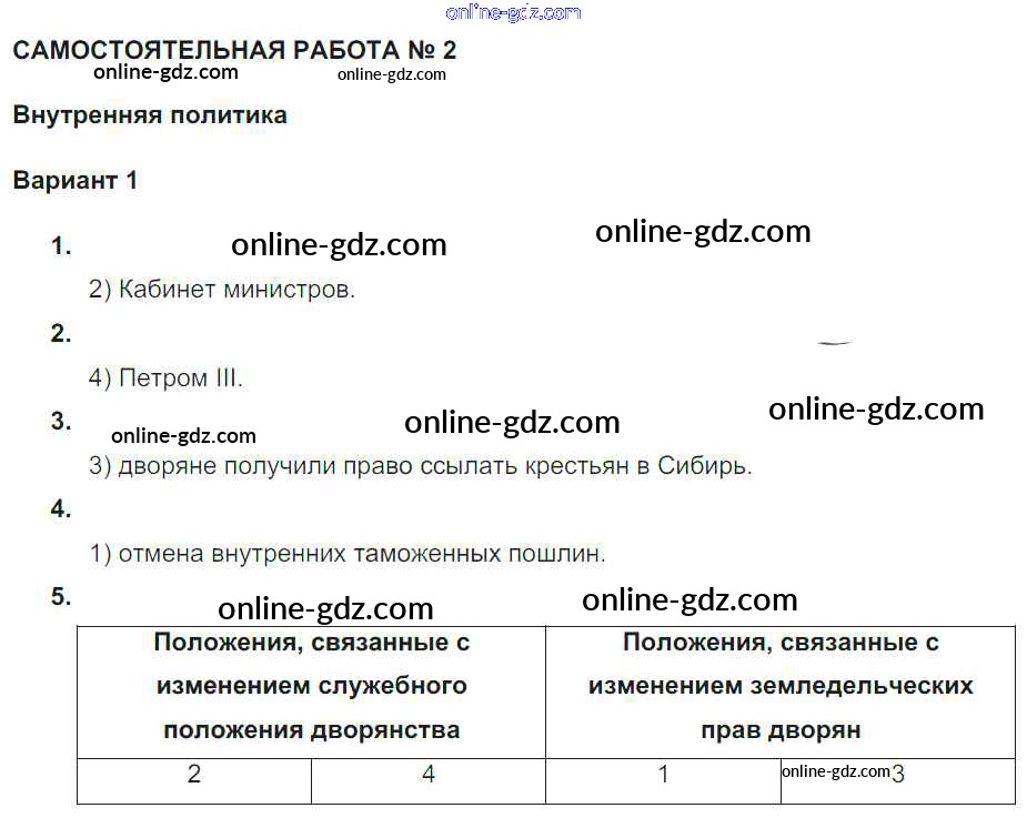 Готовые домашние задания по Истории за 7 класс Рабочая тетрадь Акиньшина, Артасов 2013 - СР-2. Внутренняя политика Российская империя в 1725-1762 гг Вариант 1