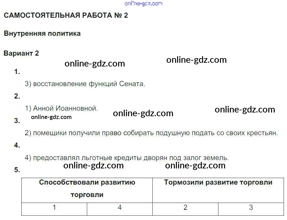 Готовые домашние задания по Истории за 7 класс Рабочая тетрадь Акиньшина, Артасов 2013 - СР-2. Внутренняя политика Российская империя в 1725-1762 гг Вариант 2