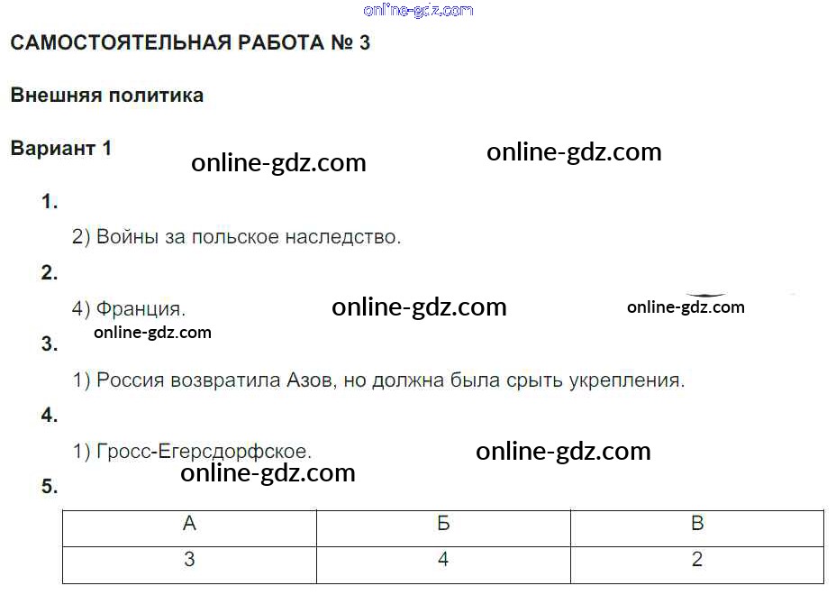 Готовые домашние задания по Истории за 7 класс Рабочая тетрадь Акиньшина, Артасов 2013 - СР-3. Внешняя политика Российская империя в 1725-1762 гг Вариант 1