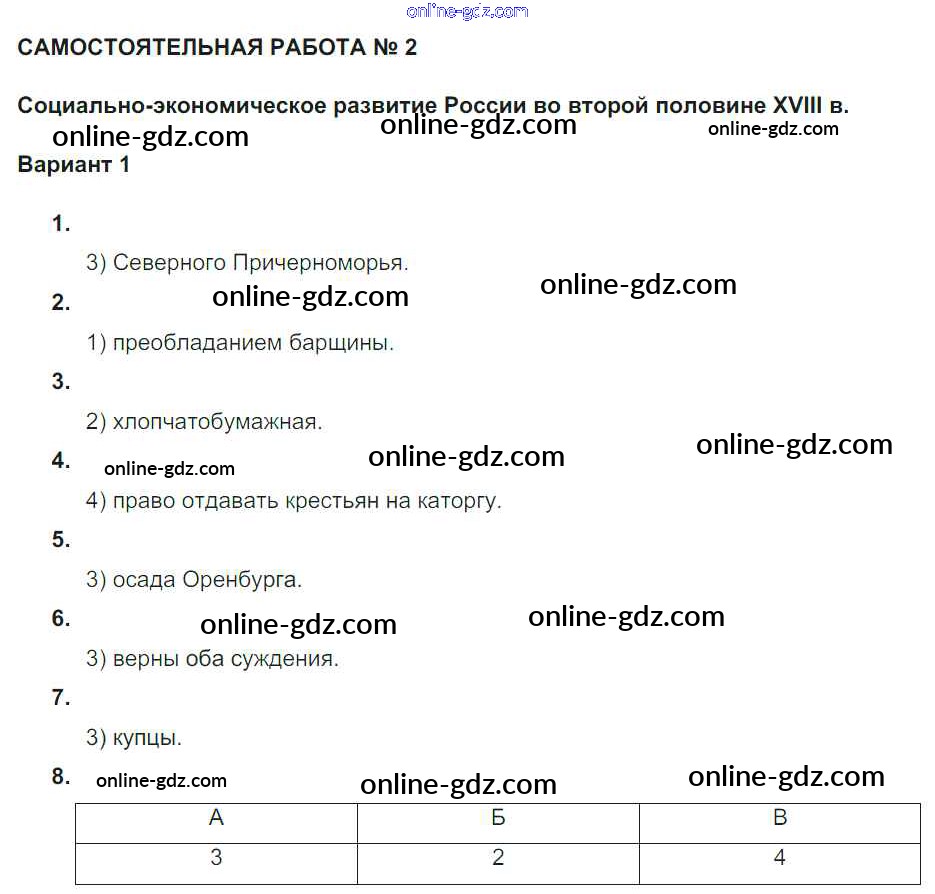 Готовые домашние задания по Истории за 7 класс Рабочая тетрадь Акиньшина, Артасов 2013 - СР-2. Социально-экономическое развитие России во второй половине XVIII века Российская империя в 1762-1801 гг Вариант 1