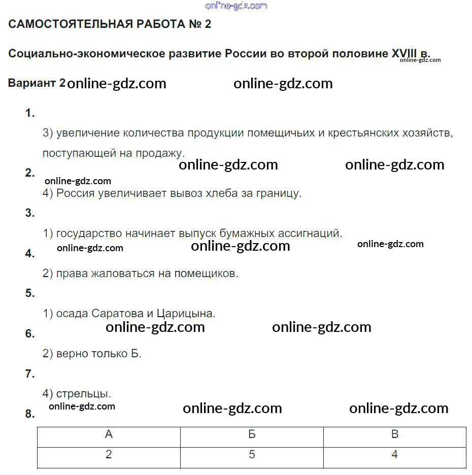 Готовые домашние задания по Истории за 7 класс Рабочая тетрадь Акиньшина, Артасов 2013 - СР-2. Социально-экономическое развитие России во второй половине XVIII века Российская империя в 1762-1801 гг Вариант 2